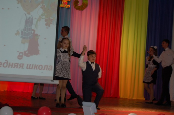 Торжественную часть праздничной программы, которая проходила в СДК «Набережный», открыли вальсом под музыку Валентины Толкуновой «Вечер школьных друзей» три пары обучающихся школы (Скок Таисия и Мурсалимов Руслан ( 4 класс), Конищева Надежда и Снигирёв Михаил (5 класс), Поперечный Алексей (8 класс) ,Конищева Маргарита (10 класс) и Алёшкин Роман , Гурьева Ангелина (10 класс.)